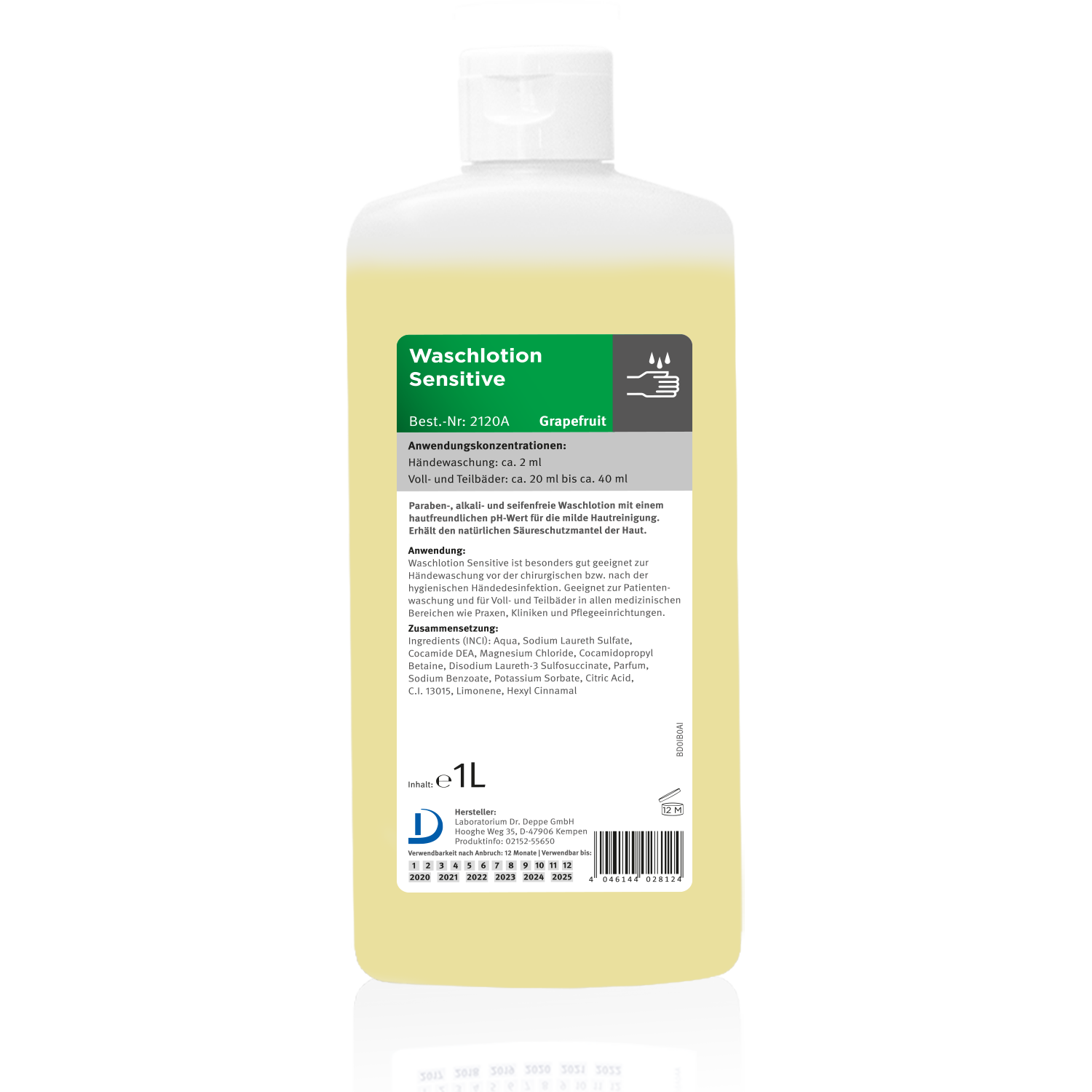 Die Waschlotion Sensitive Grapefruit mit einem fruchtigen Geruch erfüllt höchste Ansprüche an die Reinigung von Haut- und Händen, sowie für Teil- und Vollbäder. Die Waschlotion ist sehr gut hautverträglich und sparsam im Gebrauch.