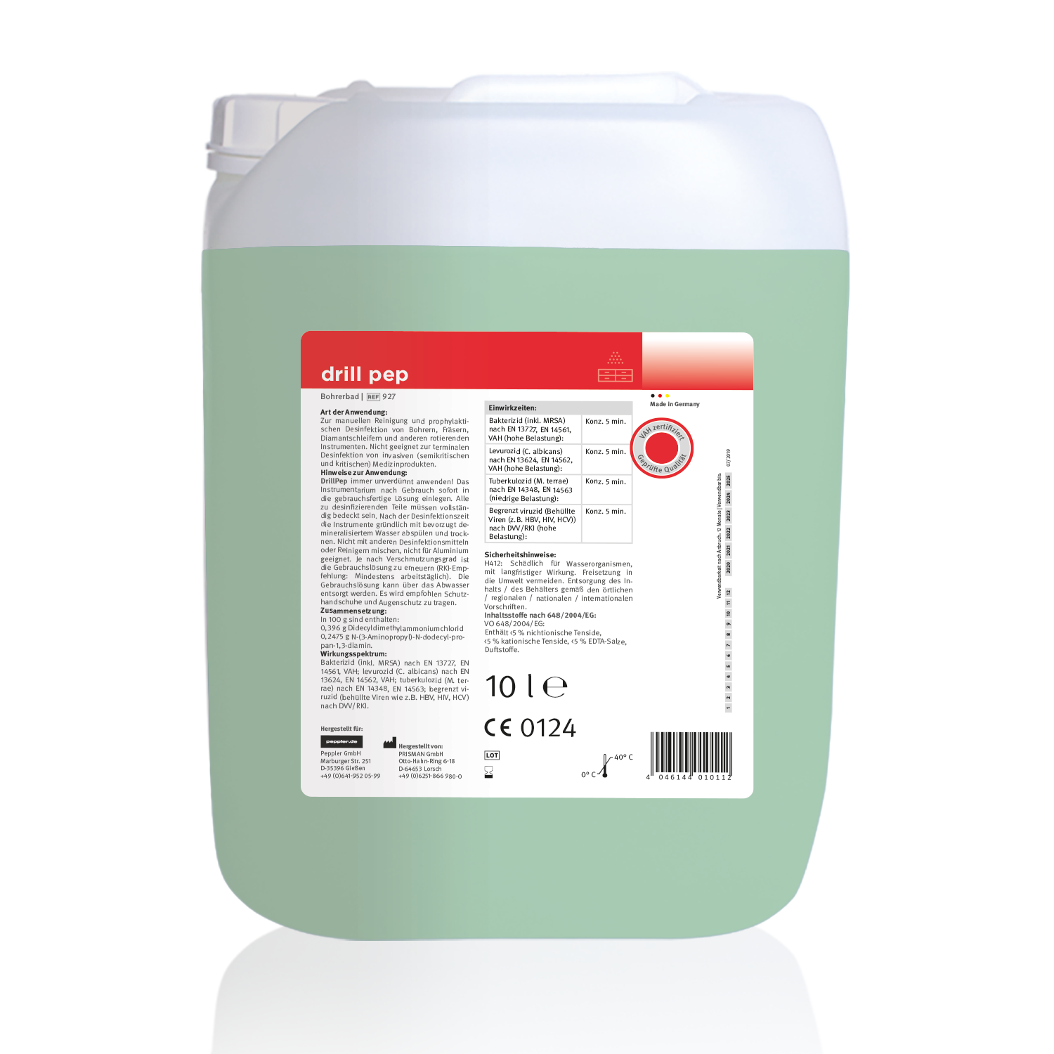 drill pep ist ein gebrauchsfertiges, hochwirksames und reinigungsaktives Kombinationspräparat zur Reinigung und prophylaktischen Desinfektion von Bohrern, Fräsern, Diamantschleifern und anderen rotierenden Instrumenten. drill pep enthält einen wirksamen Korrosionsschutz mit umfassendem Wirkungsspektrum. Nicht geeignet zur terminalen Desinfektion von invasiven (semikritischen und kritischen) Medizinprodukten.